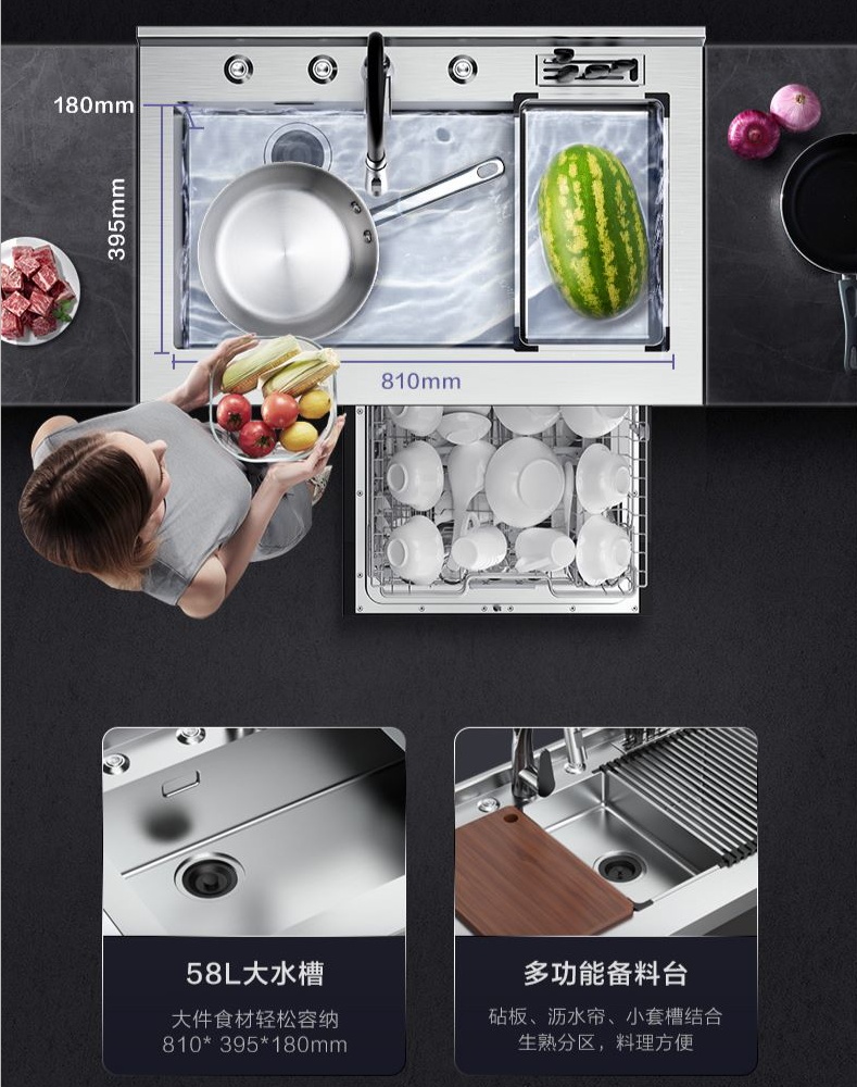 美的中式滅菌集成水槽洗碗機XQ02由多功能58L大容量水槽、10套嵌入式洗碗機、同時可選配凈水器、垃圾處理器組合,為用戶提供全套洗凈消儲方案,有效節(jié)省900mm的櫥柜空間,讓你在方寸之間也能為家人準(zhǔn)備美味大餐。