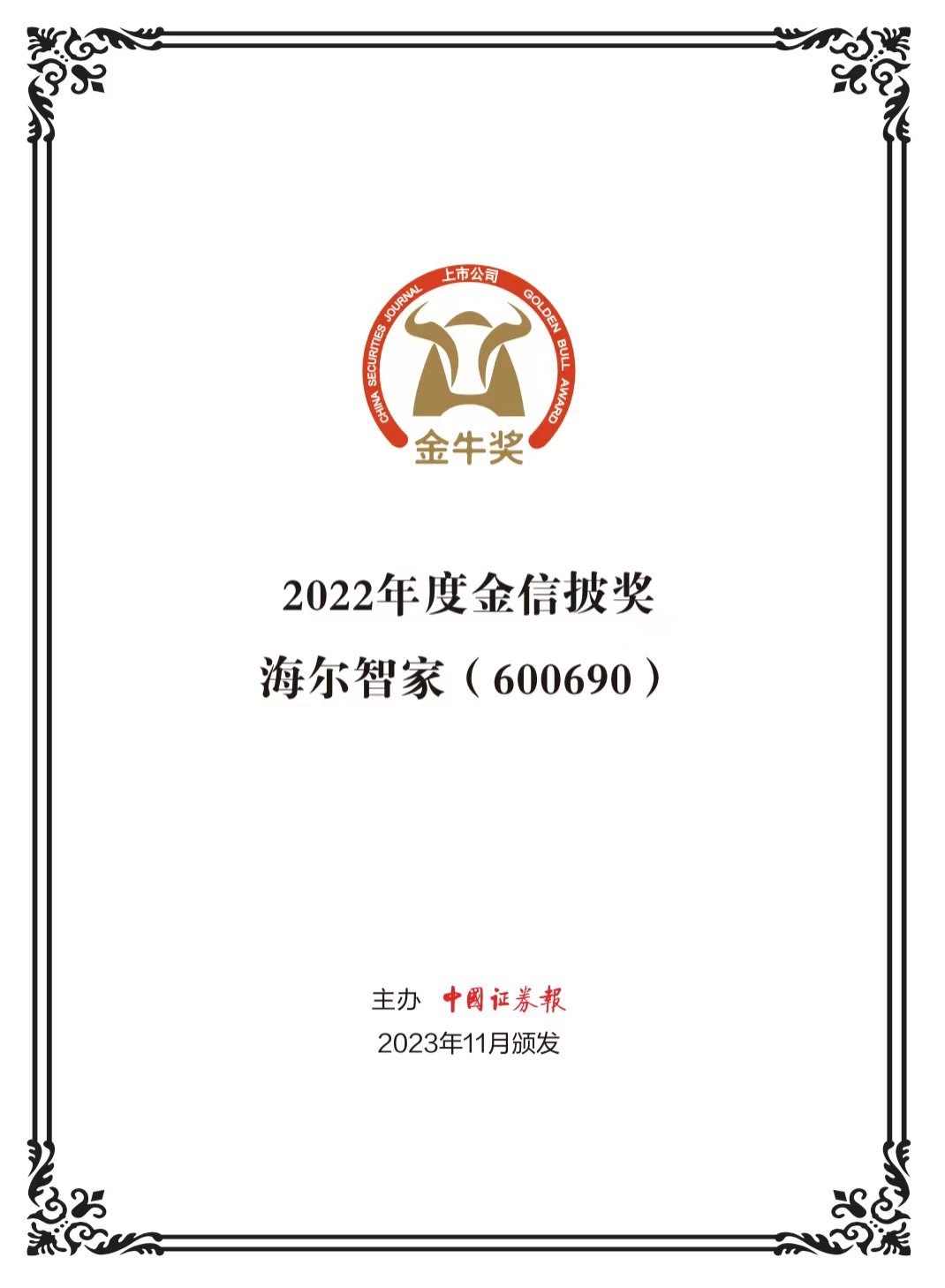 11月23日,由中國證券報、南通市人民政府聯合主辦的2023上市公司高質量發(fā)展論壇暨第25屆上市公司金牛獎頒獎典禮在江蘇南通隆重舉行。會上,備受矚目的上市公司金牛獎榜單正式揭曉。海爾智家憑借在發(fā)展規(guī)模、盈利能力、綠色發(fā)展、綜合效益、股東責任、業(yè)務創(chuàng)新、協調投資者關系等方面的優(yōu)異表現,斬獲“港股金牛獎”“金信披獎”兩項重量級大獎。此外,11月24日在南通舉辦的第一屆國新杯·ESG金牛獎頒獎典禮上,海爾智家榮獲“ESG金牛獎百強”獎項。