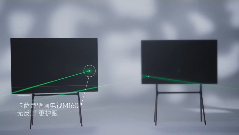 在視頻中,工作人員將兩臺激光筆擺放到合適位置后,同時打開投射在卡薩帝電視和普通4K電視屏幕上,隨后發現,卡薩帝電視屏幕由于有多重反射涂層,并沒有反射激光,不受強光干擾;而普通4K電視激光反射明顯,一部分光經過電視屏幕折射或者反射一部分光回來,容易產生眩光引起眼睛疲勞。