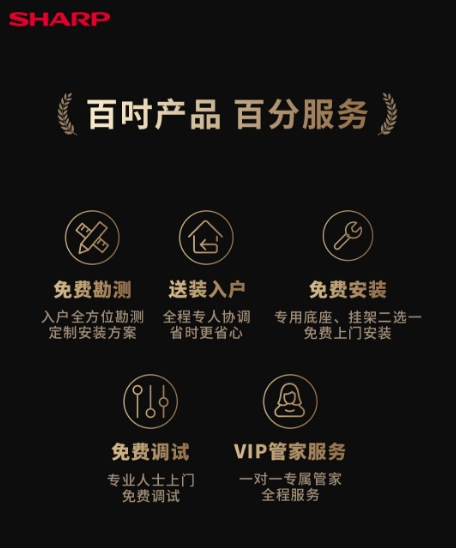 必須要提示所有用戶的是,100英寸的巨幕電視尺寸較大,寬度超過2米4,高度超過1米4,入戶安裝需要考慮入戶門、電梯橋箱或樓道的相應空間尺寸,符合條件方可安裝。夏普提供售前免費上門勘測及全程送裝調試服務,請關注“夏普中國”官方微信公眾號或撥打400-018-1628 VIP管家熱線進行預約。