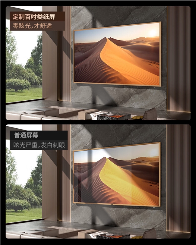 除了抗光性能優越外,類紙屏還具備多項先進功能:納米防指紋涂層使得屏幕易于清潔,保持清晰透亮;178°超廣視角則讓每一位觀眾都能獲得最佳觀影體驗;8 domain的超凡對比度提升技術讓畫面層次更加豐富;屏幕可根據環境光線進行亮度自適應調節的功能,則進一步提升了觀影的舒適性和節能性。