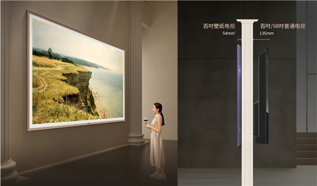 或許您會疑惑:既然是羅馬柱邊框,那電視上墻時會不會有太高凸起,顯得太過笨重?創維100A7E Pro超薄貼墻,仿佛與墻面融為一體,毫無突兀之感,徹底打消您的顧慮。其電視背板為純平形態,確保與墻面平行,實現了真正意義上的零距離上墻,仿佛一幅巨大的畫卷,使電視本身更加美觀的同時,更讓整個家居空間顯得更加整潔、大氣。想象一下,當您走進寬敞明亮的客廳,一臺百吋壁紙電視靜靜地掛在墻上,如同博物館內精美的藏品;當您打開電視時,畫面與邊框相得益彰,又為您帶來一種身臨其境的觀影體驗。當超薄無縫貼墻設計遇上百吋壁紙電視,便是一場家居與美學的完美遇見,讓您看見家居設計的每一寸可能。