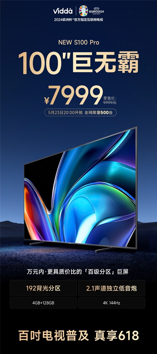Vidda表示,今年618把100英寸新品電視調到7999價位,既是一個開心的決定,也是個超前的決定,更是一個深思熟慮的決定,能讓用戶得到快樂就是Vidda最大的目標。2024歐洲杯官方指定互聯網電視Vidda NEW S100 Pro將于5月23日20:00開搶,7999元全網限量500臺,有興趣的朋友可以提前準備了!