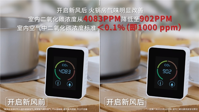 在近日于新疆吐魯番火焰山進行的一系列極限挑戰賽中,TCL小藍翼P7新風空調在啟動新風功能后,將二氧化碳濃度從高達4083PPM迅速降低到舒適的902PPM水平,TVOC氣體濃度也顯著下降,從3.131降至0.265,確保全屋無異味、不口干舌燥、不頭昏腦脹的健康呼吸。