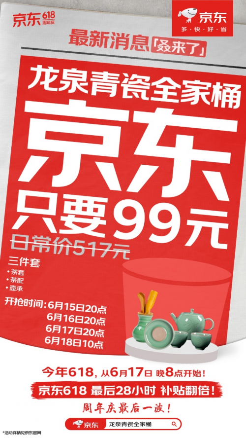 中國(guó)的茶文化源遠(yuǎn)流長(zhǎng),一套優(yōu)質(zhì)的茶具是品茶的必備。龍泉青瓷的茶套、茶配、茶承三件套全家桶,日常價(jià)517元,京東618只需99元就能搶到!6月15日、16日、17日的20點(diǎn)和18日的10點(diǎn)準(zhǔn)時(shí)開搶,數(shù)量有限先到先得。