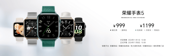 榮耀手表5將于11月1日開啟預售,11月8日正式開售,起售價999元,提供曜石黑、晨輝金、松柏綠、月影灰和雪域白五款配色,以及超過5000種豐富表盤可選,滿足用戶不同需求。