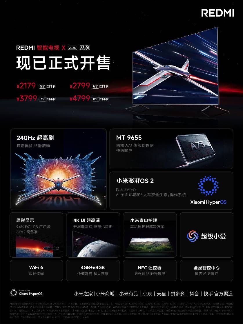 REDMI 智能電視 X 2025款同樣是4K 144Hz高刷屏,在競技模式下支持240Hz的極速刷新率和MEMC運動補償,通過毫秒級插幀算法,可大幅優(yōu)化高速畫面抖動和拖影。在Pentonic 800的加持下,REDMI 智能電視 X 2025款也支持4K UI界面,在性能強勁的Pentonic 800與小米澎湃OS 2協(xié)同配合下,可為用戶帶來高清流暢視覺與智能交互體驗。