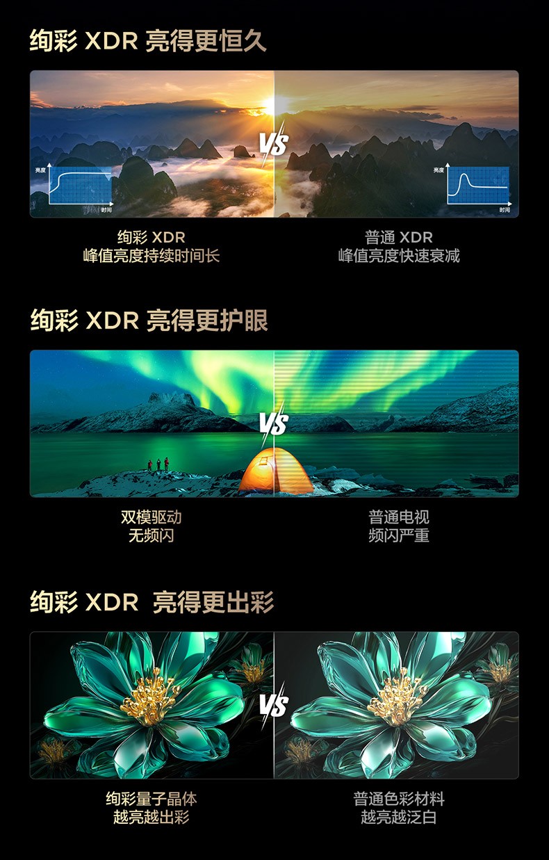 說完背光分區再來說說峰值亮度,峰值亮度作為重要指標,然而如果買到了那些只有高峰值亮度,但卻沒有先進技術支持的Mini LED電視,即便是高亮畫面也僅能維持很短的時間,想象一下,在看一些精彩大片時,電視高亮畫面亮度就會出現驟降,一些原有的畫面細節就不能很好地呈現,真的很影響觀看體驗。而時下最為“流行”的絢彩XDR技術,則是很好的解決了這一問題。