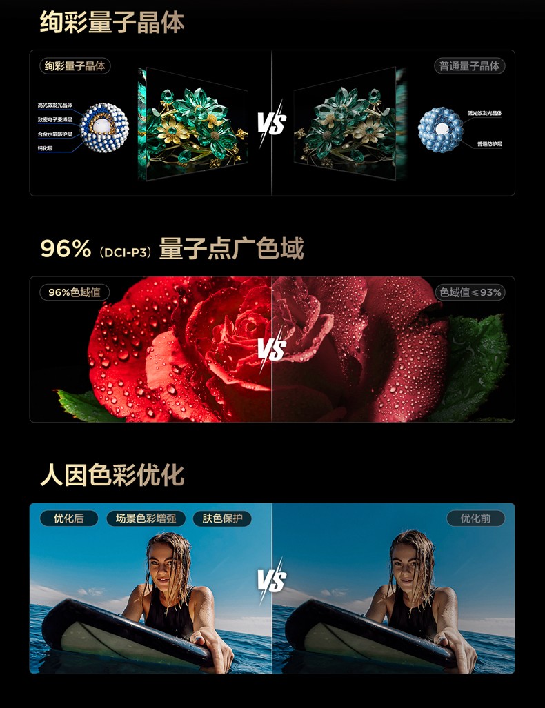 另外,它還能夠識別圖像的內容,并且根據人眼對不同畫面的敏感度做精細化的畫質調校,讓畫面呈現出來的色彩更符合人眼喜好,不僅能讓色彩“好看”,更能“看得好”、“看得舒服”。所以說,想要畫面色彩更還原,建議首選量子點Pro 2025技術。