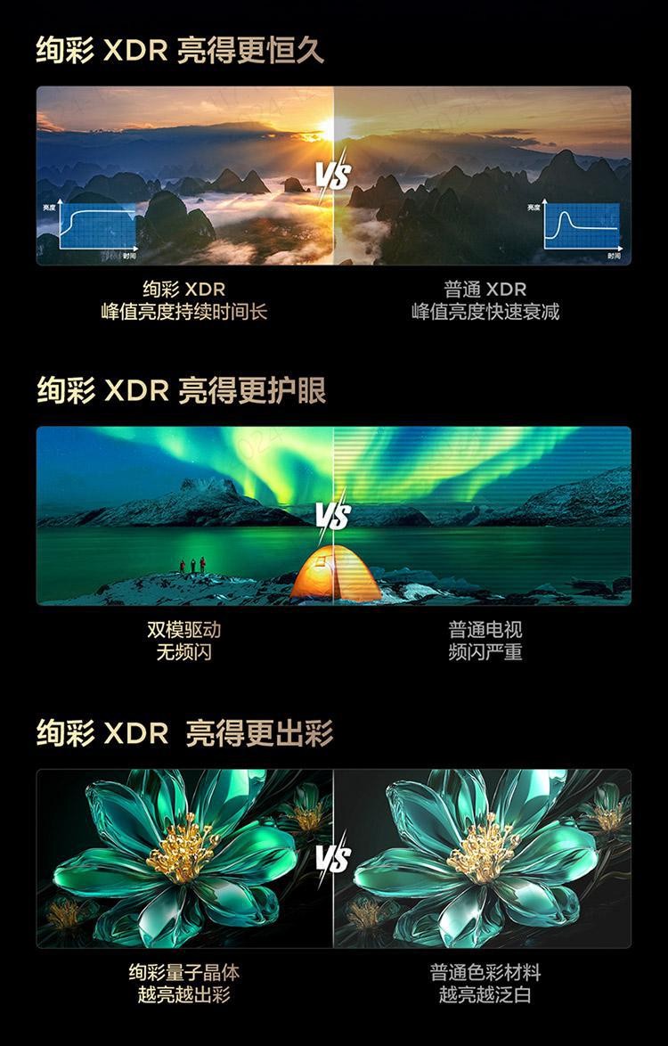 接著,再來聊聊峰值亮度,以前總覺得電視亮度不夠持久,高光場景一閃而過,還沒看清就暗下去了。TCL這次推出的絢彩XDR技術,特別搭載了“超動態控光”技術,讓峰值亮度時長加長,還通過絢彩量子晶體,讓暗得更深邃,亮得更耀眼。并且在雙模驅動技術的加持下,它會根據你的觀看內容自動調節亮度,既節能又護眼,減少熬夜追劇對眼睛的傷害,電費也省了。