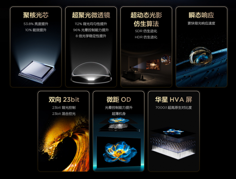 當(dāng)行業(yè)面臨由于邊際遞減效應(yīng),導(dǎo)致增加分區(qū)數(shù)無法有效提升畫質(zhì)效果的僵局之時(shí),TCL深刻意識到了只有提升底層技術(shù)才能打破困局,借助多年以來的技術(shù)經(jīng)驗(yàn)和沉淀,從背光到成像的全鏈路,通過聚核光芯、新一代聚光微透鏡、微距OD、瞬態(tài)響應(yīng)、雙向23bit、超動態(tài)光影仿生算法以及華星HVA屏形成了一套系統(tǒng)性的控光方案,讓每一環(huán)的控光效果都發(fā)揮到了極致,從而使萬象分區(qū)的控光效果能夠比普通分區(qū)強(qiáng)數(shù)倍。