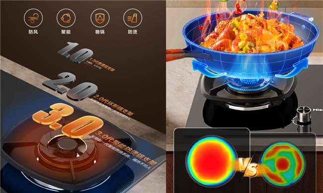 針對傳統燃氣灶可能存在的火力不足、燃料利用不充分、油煙大以及烹飪火候難以精準控制等痛點問題,海信DB32pro升級五維立體混氧燃燒系統,通過三層進風設計保證燃氣與氧氣充分混合,減少一氧化碳產生,大幅提升火焰溫度和燃燒效率,180°寬域調控可以實現更精細的火候調節,滿足不同烹飪需求,從源頭減少油煙的產生,提升烹飪效率和菜肴質量,改善廚房環境。