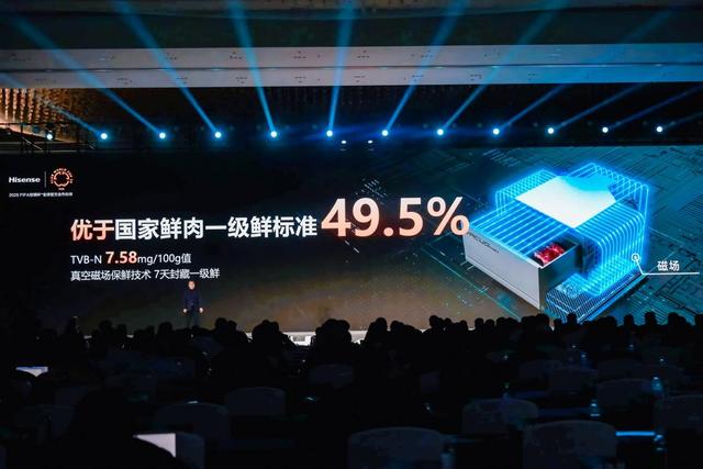 另一方面,該冰箱采用耦合磁場保鮮技術,通過磁致生物學效應,一方面促進水分子有序排列,另一方面降低酶分子活性,真正將保鮮深入到分子層面,實現7天一級鮮。實驗數據顯示,在真空磁場保鮮技術加持下,放置其中儲存7天的鮮肉TVB-N值優于一級鮮肉國標。