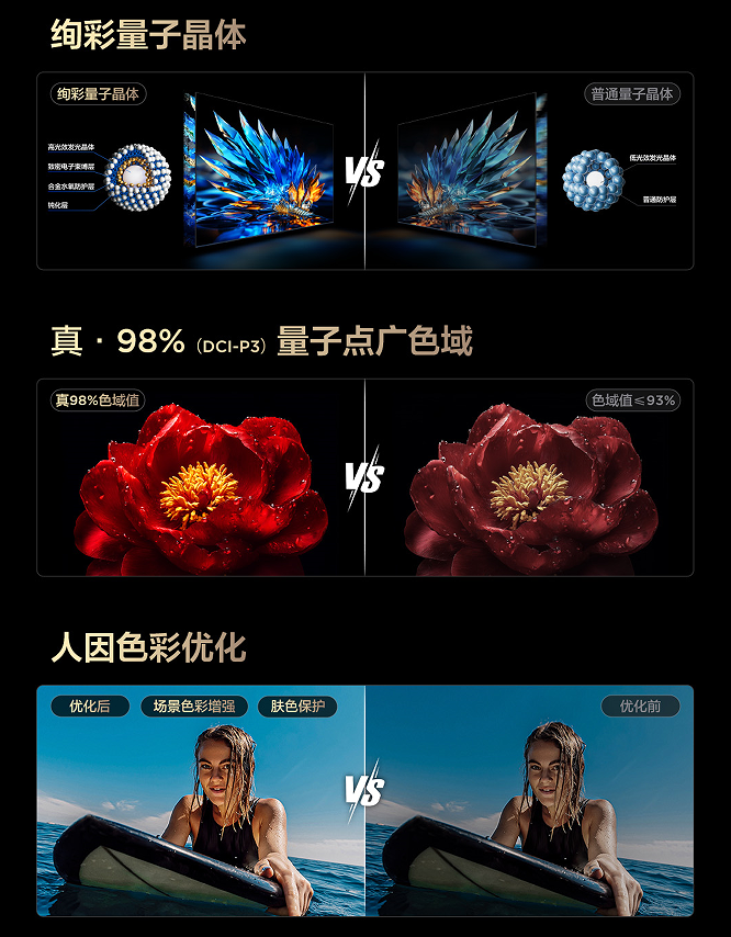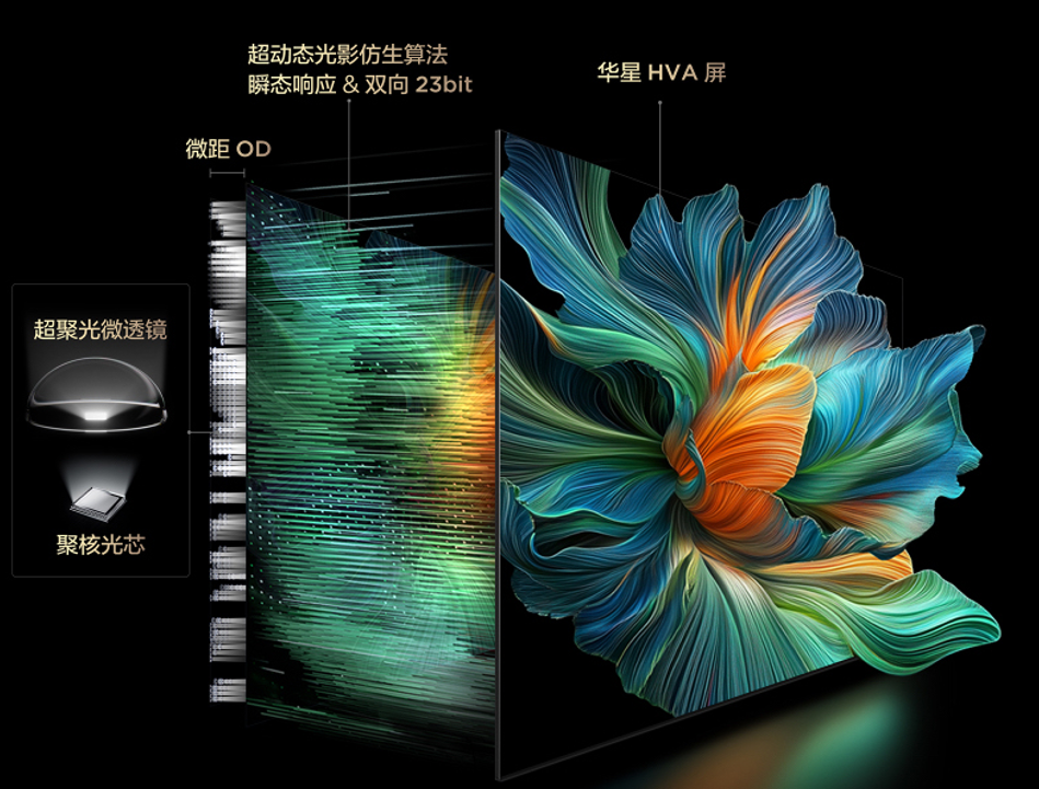 相較于普通VA屏5000:1的對比度,蝶翼星曜屏的原生對比度高達7000:1,比普通IPS硬屏(1200:1)更是高5倍,由于采用了納米級仿生材料,并且液晶分子呈現“蝶翼”狀排列,因此無論是動態亦或是靜態的對比度都更加出色,畫面細節更加細膩,且有效降低屏幕反光問題!都說電視畫質的好壞,屏幕占一半,因此,這次蝶翼星曜屏技術的下放,使得這次新品的市場競爭力也是得到了大飛躍。