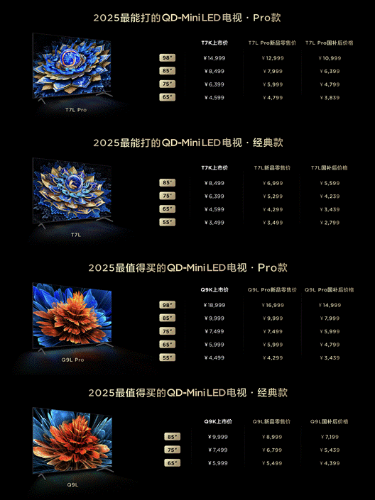 綜合以上幾個選購要點,在眾多品牌中,最近我就發現TCL最新發布的T7L系列和Q9L系列,不僅各項目配置高,而且質價比相當能打,直接把萬元旗艦技術下放到了千元級產品線!