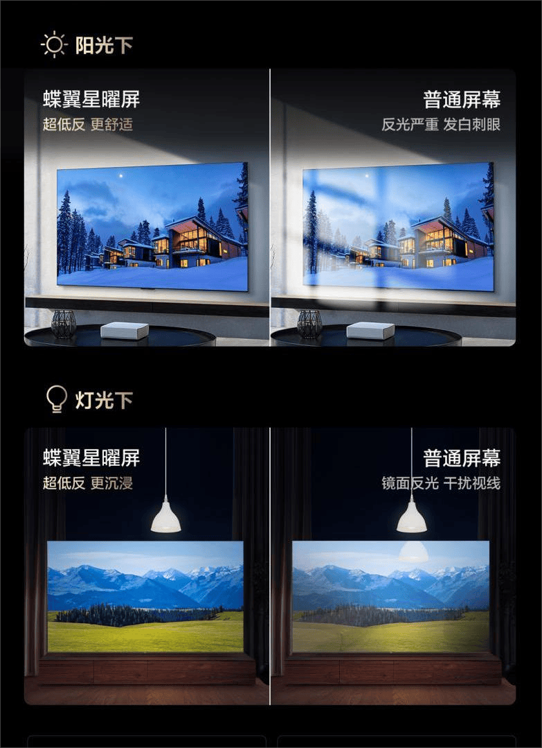先說說我最看重的抗反,T7L Ultra搭載華星高階HVA屏——蝶翼星曜屏,采用高端機(jī)同等的“鏡面低反”抗反方案,不是靠低成本磨砂膜湊數(shù)的那種。屏幕外層采用行業(yè)最高等級的0.5% LR低反膜,搭配液晶89度內(nèi)低反,形成內(nèi)外雙低反,整機(jī)反射率才 1.8%,什么概念?之前查過,市面上常見的AGLR抗反屏,反射率都只能做到2.6%,而且靠的是磨砂膜擋光,磨砂膜必定導(dǎo)致畫面對比度下降,畫質(zhì)降低;但這臺不一樣,無論是白天陽光照射還是晚上客廳燈光干擾,屏幕上幾乎看不到反光,連窗簾都不用拉,人物的膚色、衣服的紋理都清清楚楚,非常細(xì)膩。