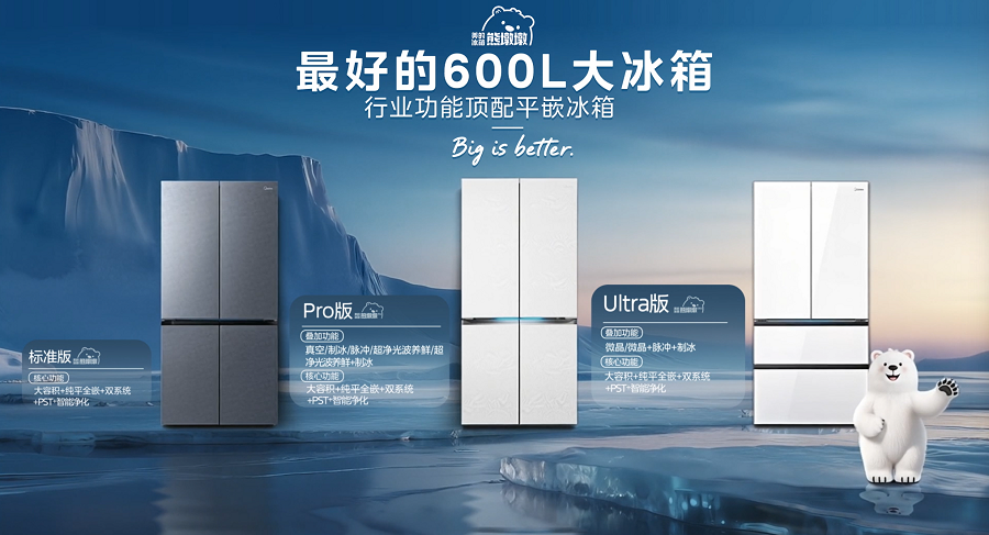 美的熊墩墩系列冰箱不僅全系覆蓋600L大容積、平嵌設(shè)計、雙系統(tǒng)、凈化功能等核心需求,更以階梯式功能選配,為消費(fèi)者提供標(biāo)準(zhǔn)版、Pro版和Ultra版三大版本。其中,實用標(biāo)準(zhǔn)版,滿足用戶日常囤鮮、凈化的基礎(chǔ)需求;品質(zhì)Pro版,讓注重健康和營養(yǎng)的家庭可以選擇帶超凈光波養(yǎng)鮮或脈沖凈化等功能的型號;?Ultra版獨(dú)有的微晶一周鮮功能,可以實現(xiàn)肉類7天不凍原鮮,讓想做快手菜的家庭節(jié)省了肉類解凍時間。