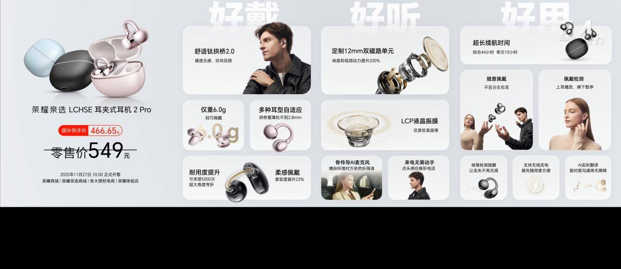 11月24日,榮耀500系列新品發布會重磅舉行,正式發布榮耀親選LCHSE耳夾式耳機2 Pro(以下簡稱為榮耀耳夾耳機2 Pro)。榮耀耳夾耳機2 Pro在外觀設計、佩戴舒適度、音質表現、續航能力、交互體驗及AI翻譯等方面帶來全方位越級體驗,是同檔位綜合性能最均衡的耳夾耳機。榮耀耳夾耳機2 Pro于11月27日10:00全渠道正式開售,國補到手價466.65元。