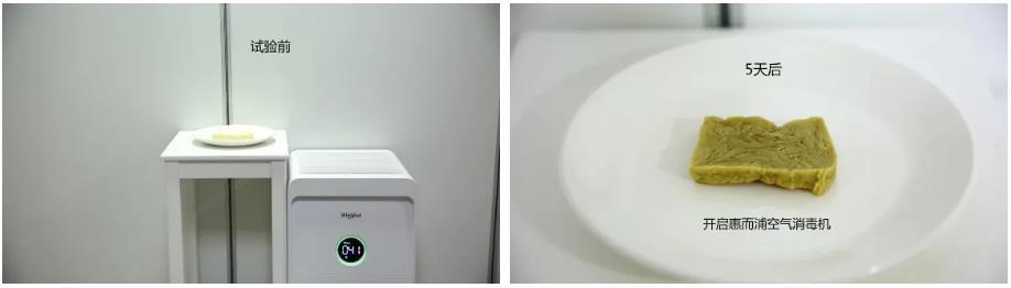 從圖中可以看出,經過5天的試驗對比,沒有消毒機保護的豆腐已經發霉變質;而通過消毒機保護的豆腐除了四周較干外,并沒有生長任何的霉菌。可見,惠而浦空氣消毒機夠對室內空氣進行凈化,效果顯著。