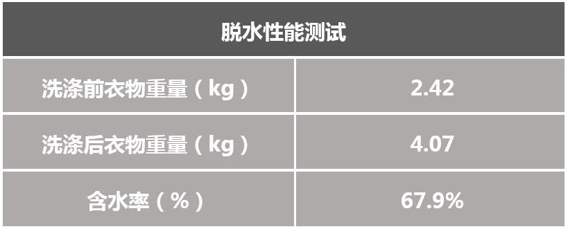 從測(cè)試結(jié)果可以看出,脫水后衣物的含水率為67.9%,洗后衣物感覺(jué)沒(méi)有什么褶皺,摸起來(lái)有明顯的潮濕感。