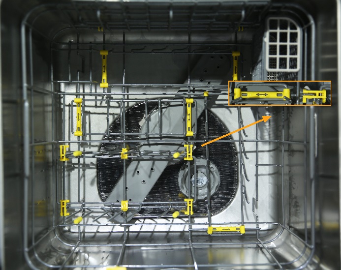 內部碗籃為兩層結構,下層設有盤子區,可以放置各種深淺大小的盤子,大湯碗區可以放置湯碗和大面碗等餐具,杯子區可以放置玻璃杯和作料碟等,筷子籠可以放置筷子或者湯勺。在碗架上,所有黃色標識均是可以調節的,箭頭一樣的黃色標識,表示碗架可以左右移動;黃色蓋帽標識則標識此處可以翻折。