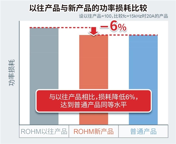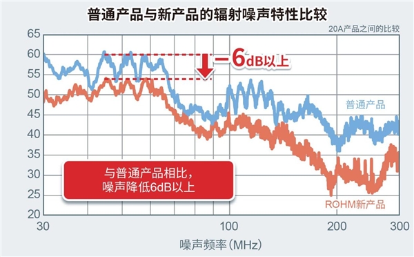 通過(guò)優(yōu)化內(nèi)置FRD的軟恢復(fù)性能和內(nèi)置IGBT,使輻射噪聲比普通產(chǎn)品低6dB以上(比較峰值時(shí))。其業(yè)內(nèi)出色的噪聲特性,使得削減以往所需的噪聲濾波器成為可能。此外,通過(guò)內(nèi)置ROHM最新的IGBT元件,降低了導(dǎo)通損耗和開(kāi)關(guān)損耗,與以往產(chǎn)品相比,功率損耗降低6%(fc=15kHz時(shí))。因其在業(yè)內(nèi)具有超高特性,從而有助于降低各種設(shè)備的功耗。