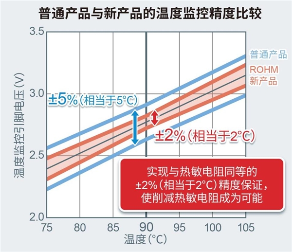 相比普通產(chǎn)品±5%(相當(dāng)于5℃)(90℃時(shí))的溫度監(jiān)控功能保證,新產(chǎn)品的精度大大改善,可達(dá)到與熱敏電阻同等的保證精度±2%(相當(dāng)于2℃)(同樣90℃時(shí)) 。這使得削減以往高精度溫度監(jiān)控器所需的外置熱敏電阻數(shù)量成為可能,從而有助于減少元器件數(shù)量和設(shè)計(jì)工時(shí)。
