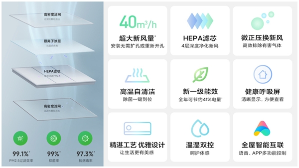據了解,此款產品采用小米新一代雙混動新風系統,自研離心渦輪增壓技術,將室內外空氣深度凈化,再通過二次增壓釋放新風。結合小米自研新風系統技術,用戶無需擴孔或重新開孔,即可實現40m3/h大新風量,高效稀釋室內有害氣體,讓空氣快速流通,用實時換新的潔凈含氧空氣解決密閉空調房不通風的問題。同時高等級HEPA濾芯配合4層深度凈化,能有效抗菌抗病毒,保持室內空氣清新。