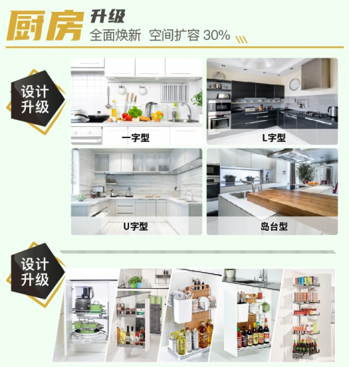 空間規劃的科學性和實用性一直是百安居在完成空間升級時最看重的問題。在廚房的空間規劃上,百安居將空間利用效率最大化,根據消費者不同戶型、采光與審美需求,通過一字型、L字型、U字型和島臺型等不同設計,合理規劃使用動線,有效縮短下廚時間;同時有效利用廚房易被忽略的“小角落”實現收納功能,維持臺面整潔空曠的同時減少打掃死角,提高空間利用率。