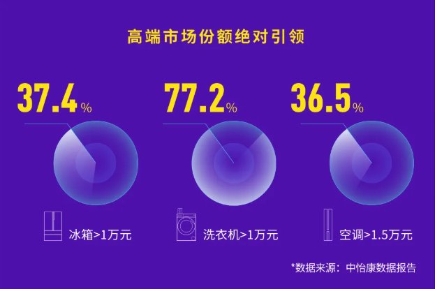 若將卡薩帝單獨放入高端家電市場做分析,中怡康數據進一步顯示,卡薩帝品牌萬元以上冰箱份額達到37.4%,萬元以上滾筒洗衣機份額達到77.2%,1.5萬元以上空調份額達到36.5%。