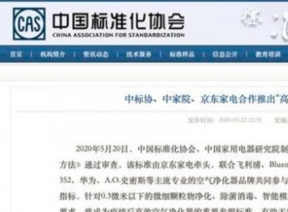 ?5月20日,中國標準化協會、中國家用電器研究院、中家院(北京)檢測認證有限公司提出并測定的 《高效空氣凈化器性能技術要求及評價方法》正式出爐。該標準由京東牽頭組織,飛利浦、Blueair布魯雅爾、松下、IAM、夏普、IQAir、352、華為、A.O.史密斯等主流空氣凈化器廠商均參與到標準制定中。 [閱讀全文]