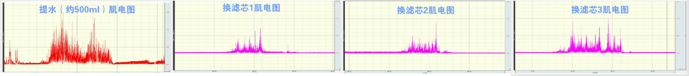從測試數據看,這款R2500RA3的三根濾芯換芯耗時都很短,真的做到了“一拉一推”就可完成換芯。同時手臂的肌電值圖像顯示,通過“提一瓶500ml礦泉水”的耗力和換芯的耗力對比,清晰的將換芯耗力這件事呈現的一目了然。