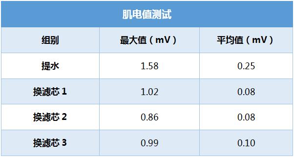 以上測試數據還可以看出,這款R2500RA3凈水機更換自帶的三種濾芯時,不僅非常省力,而且所耗的肌電值差異很小,還沒有提起一瓶500ml的礦泉水費力!哪怕是換最重的RO濾芯時,耗力也僅是舉礦泉水耗力的一半,由此可見,整個換芯過程確實是又快又省力!