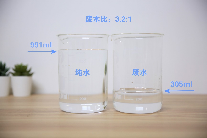 測試時,我們用兩個相同規格的容器,同時取機器制水時產的純水和廢水,從而計算出廢水比。最后的測試結果如下: