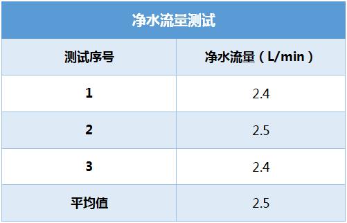 從上圖可看出,這款凈水機的實測凈水流量為2.5L/min,相當1min就能接滿一大桶可樂,6s就能接滿一杯水(250ml),這種出水體驗感相當不錯。