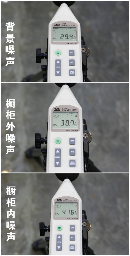 從圖中儀器測試數據可以看到,在背景噪聲為29.4dB的情況下,當關閉櫥柜門時,凈水機制水過程中的最大噪聲約為38.7dB,這個量級不會干擾到休息和睡眠;打開櫥柜門時,凈水機的制水噪聲也僅為41.6dB,相當于室內小聲交談的聲音,也是完全可以接受的。