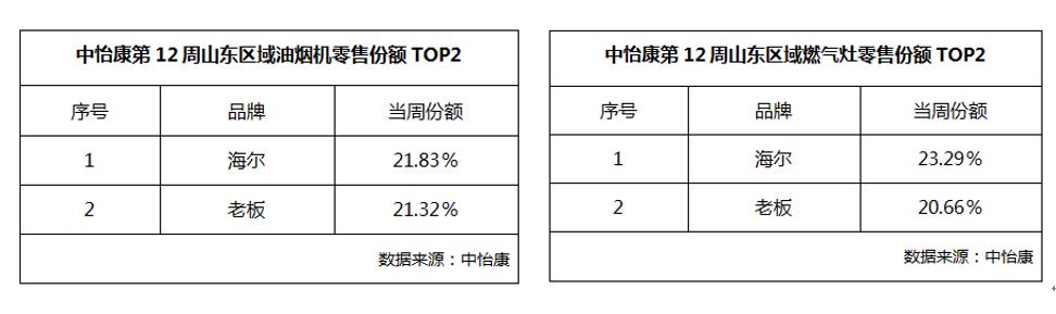 另外,中怡康重點盤點了日常使用頻率較高的油煙機(jī)和燃?xì)庠钇奉悺牡?2周數(shù)據(jù)來看,山東區(qū)域海爾油煙機(jī)和燃?xì)庠畹氖袌龇蓊~分別是21.83%和23.29%居第一,老板油煙機(jī)和燃?xì)庠畹氖袌龇蓊~分別是21.32%和20.66%。