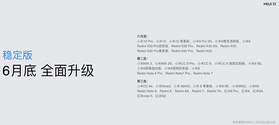 按本次發布會所講,MIUI12的穩定版也將在6月底起陸續推送升級。如此一來,小米10 Pro、小米10、小米10 青春版、小米9 Pro 5G、小米9尊享透明版、小米9、Redmi K30 Pro變焦版、Redmi K30 Pro、Redmi K30 5G、Redmi K30、Redmi K20 Pro尊享版、Redmi K20 Pro、Redmi K20,共13款機型都可陸續升級到最新的MIUI12穩定版。后續升級計劃中,第二批升級支持機型具體包括:小米MIX 3、小米MIX 2S、小米CC 9 Pro、小米CC 9、小米CC 9 美圖定制版、小米9 SE、小米8屏幕指紋版、小米8透明探索版、小米8、Redmi Note 8 Pro、Redmi Note7 Pro、Redmi Note7。第三批升級機型具體包括:小米CC 9e、小米Note3、小米MAX3、小米8青春版、小米8 SE、小米MIX2、小米6X、Redmi Note 8、Redmi 8、Redmi 8A、Redmi 7、Redmi 7A、紅米6 Pro、紅米6、紅米6A、紅米Note5、紅米S2。具體升級計劃可關注MIUI官方信息或前往MIUI官網了解。