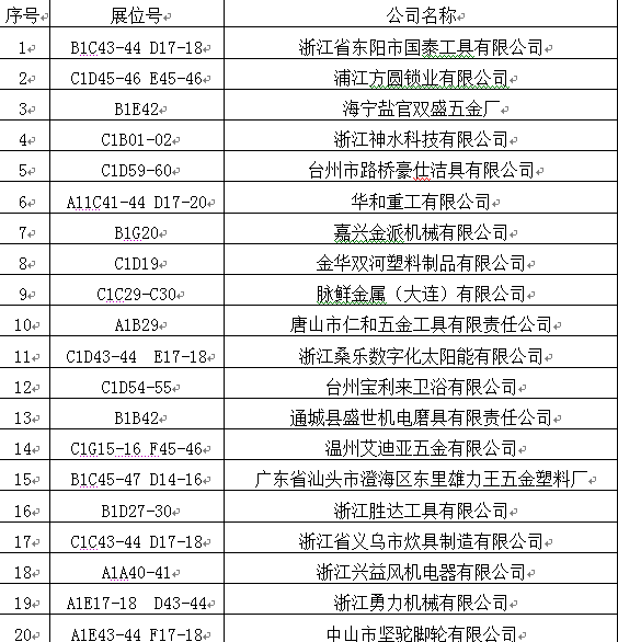 2015第12屆中國國際五金電器博覽會將于4月20~22日在義烏隆重開幕,為更好地服務于企業,鼓勵企業創新創優,該博覽會組委會舉辦《優秀參展企業》評獎活動,企業踴躍報名,現經中國國際五金電器博覽會組委會辦公室對申報《優秀參展企業》評獎活動的企業進行初選,以下公司入圍20強,獲得復選的投票資格: