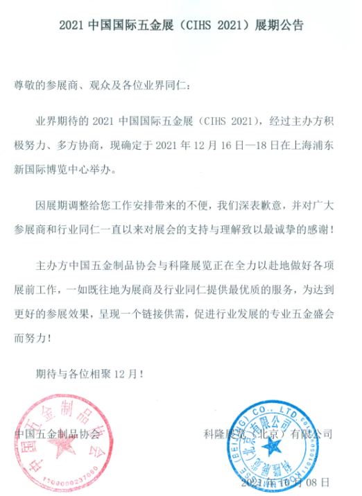 鑒于目前上海疫情情況,為保障所有參展參會(huì)人員的健康安全,力促行業(yè)發(fā)展并切實(shí)有效地保證展會(huì)效果,中國(guó)國(guó)際五金展組委會(huì)經(jīng)過(guò)多次磋商及審慎考量,決定將原定于2022年9月21-23日在中國(guó)上海新國(guó)際博覽中心
